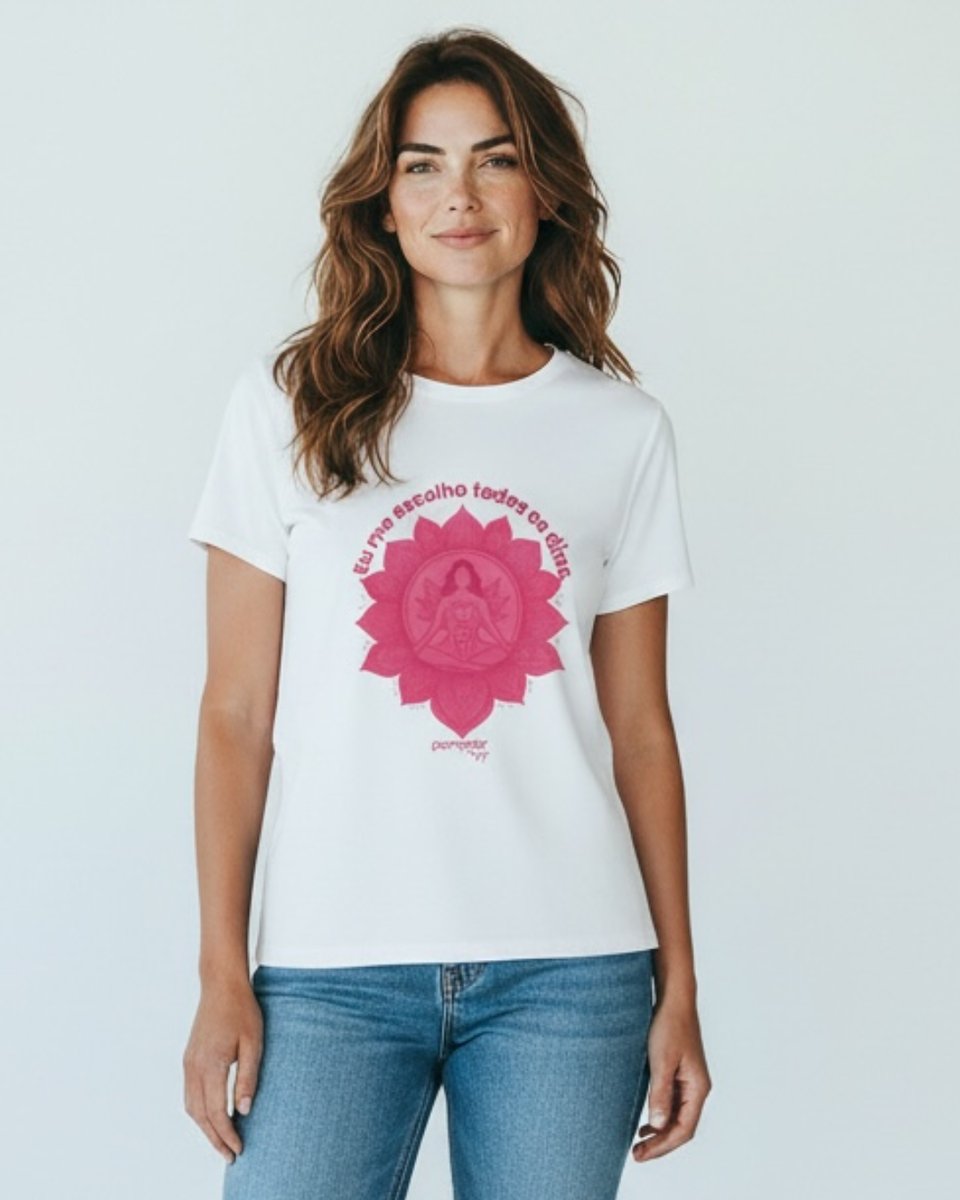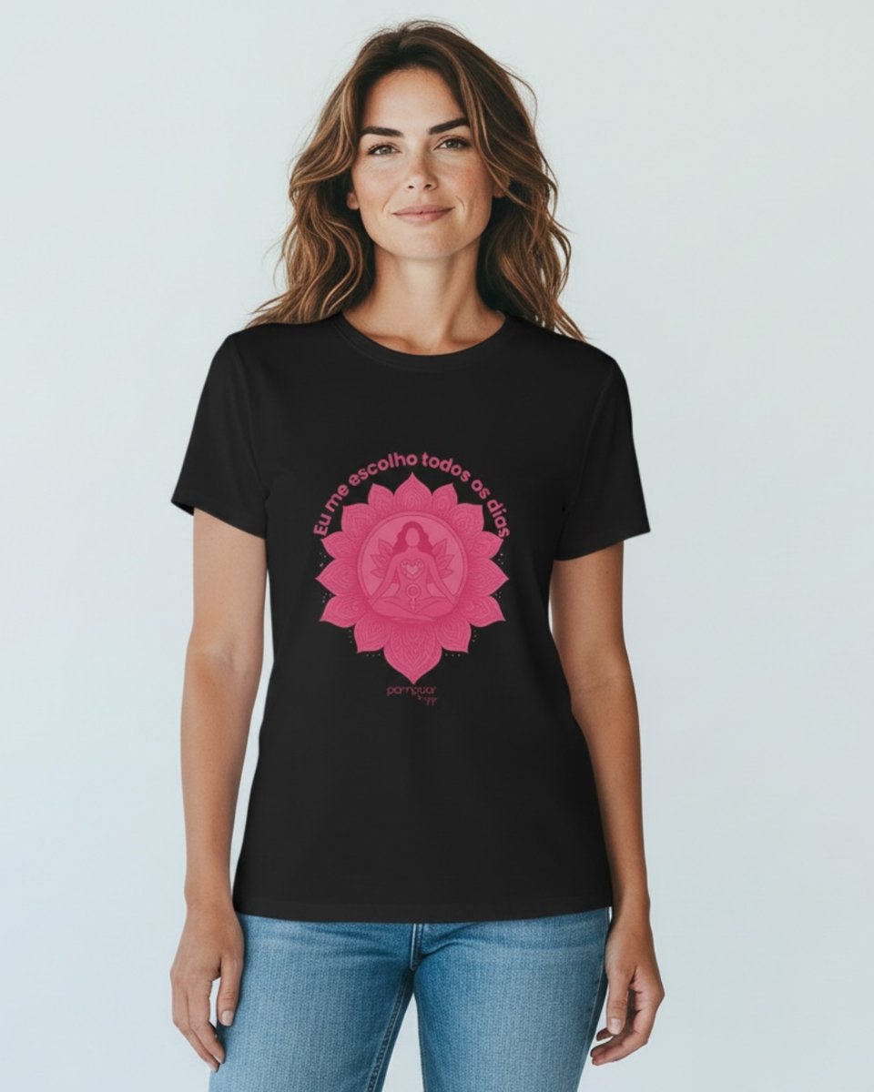 A camisa  com a mandala rosa traz a mensagem mais poderosa do amor-próprio: “Eu me escolho todos os dias.”