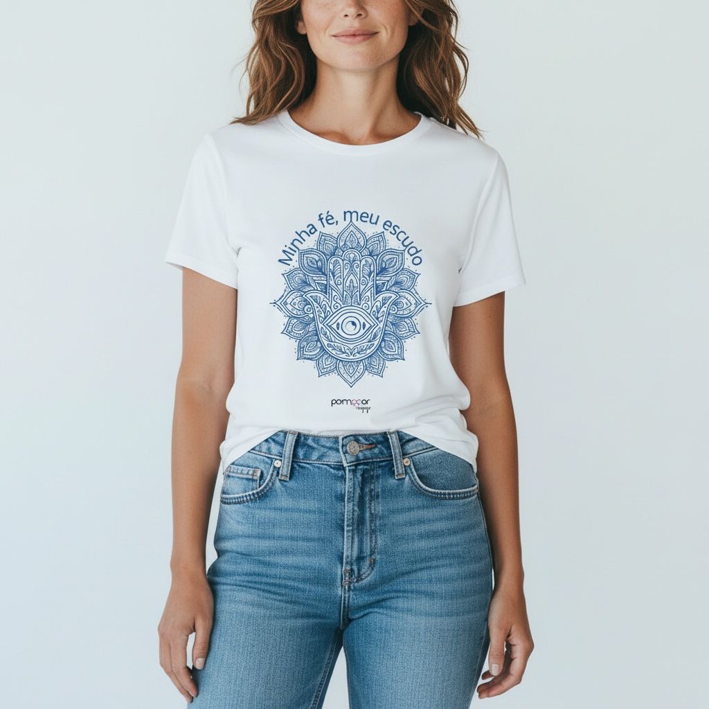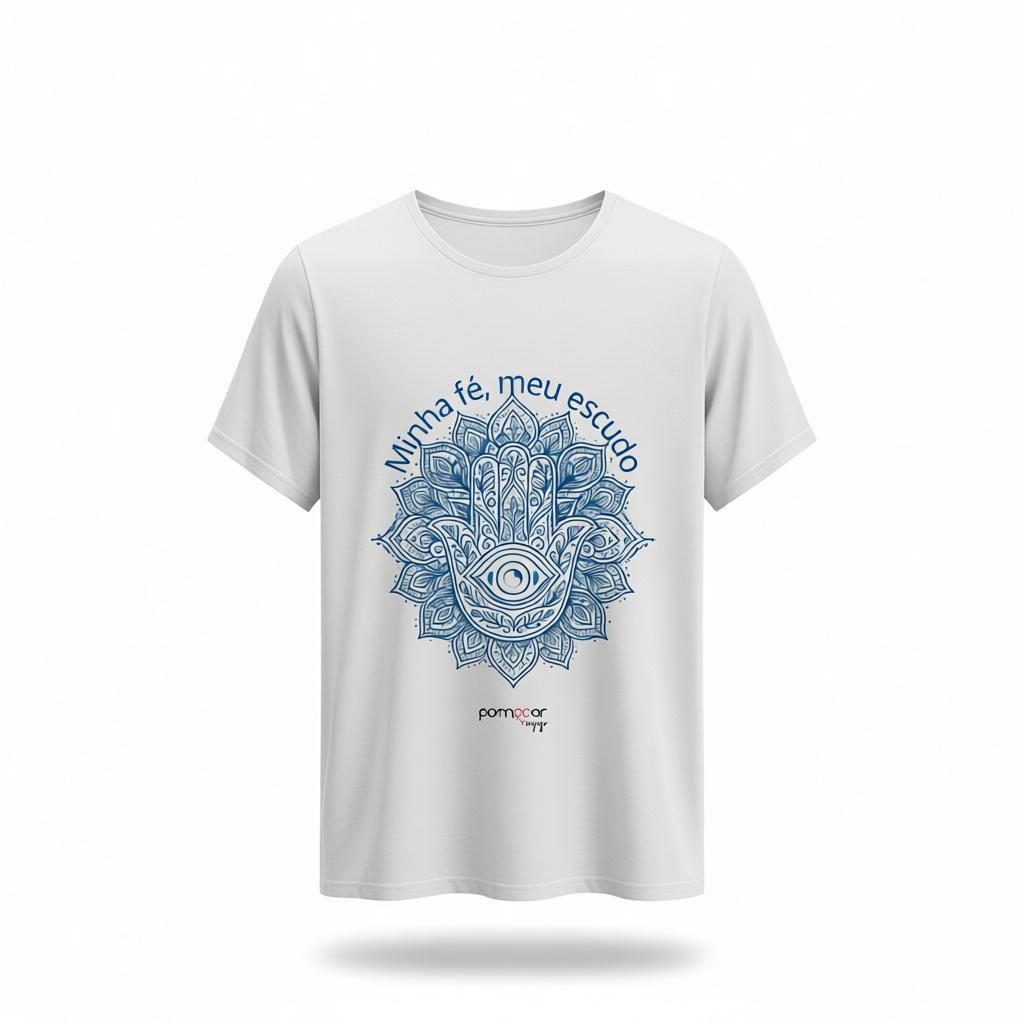 A camisa branca com estampa azul do olho grego traz a energia da proteção e da tranquilidade, combinando a pureza do branco com a força espiritual do azul.